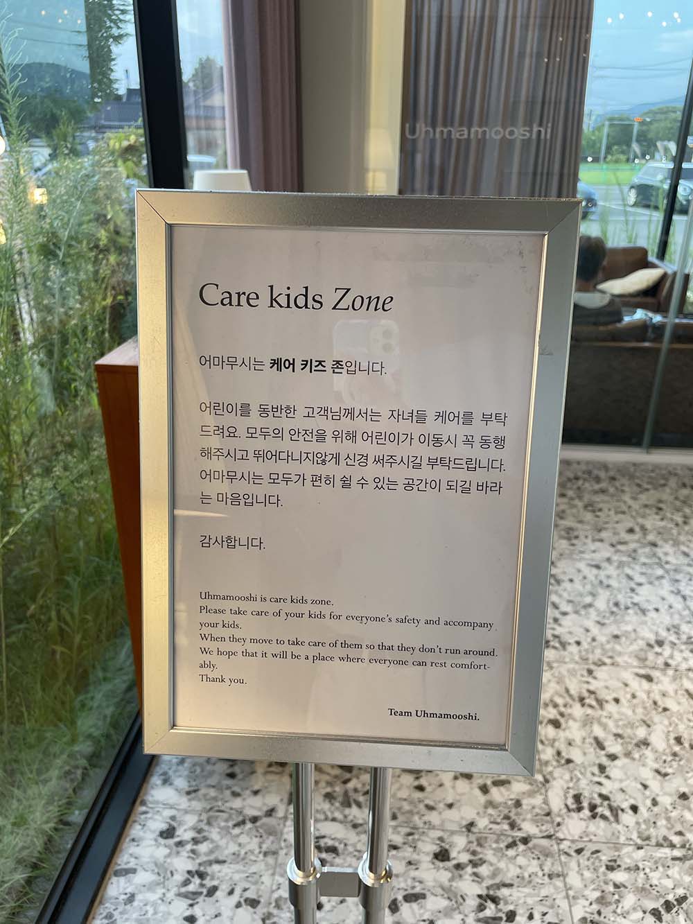 저는 특히 좋았던 부분이 '케어 키즈 존' 이에요. 요즘 카페들은 노키즈 존이 많은데 어마무시는 오히려 케어 키즈 존이라 어린이들도 같이 방문할 수 있으면서 다른 손님들도 편히 쉴 수 있는 공간을 의도했다는 점이 정말 좋았어요.