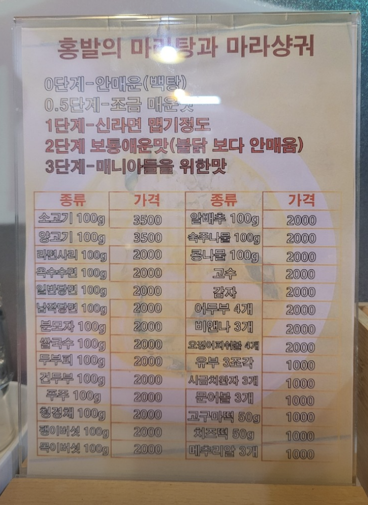 제가 이번에 홍발에서 방문해서 주문한 메뉴는 '원조마라탕 1단계 1인분, 2단계 1인분', 그리고 '꿔바로우 대'에요.